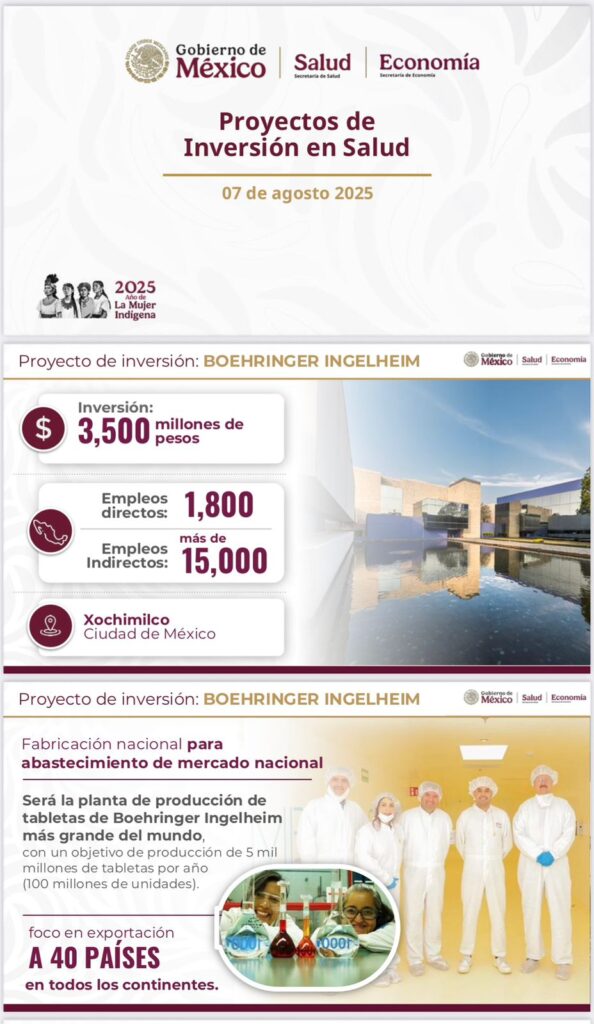 • Boehringer Ingelheim (3,500 mdp): ampliará su planta en Xochimilco para convertirla en la más grande del mundo, con capacidad de producir 5 mil tabletas por minuto para el mercado local y exportaciones a más de 40 países.