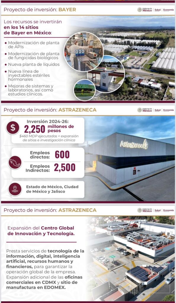 • AstraZeneca (2,250 mdp): impulsará investigación clínica, ampliará su Centro Global de Innovación y su fábrica en el Estado de México, creando 600 empleos directos y 2,500 indirectos.