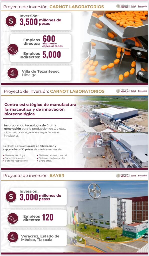• Carnot Laboratorios (3,500 mdp): construirá una nueva planta en Villa de Tezontepec, Hidalgo, que generará 600 empleos directos y 5 mil indirectos.