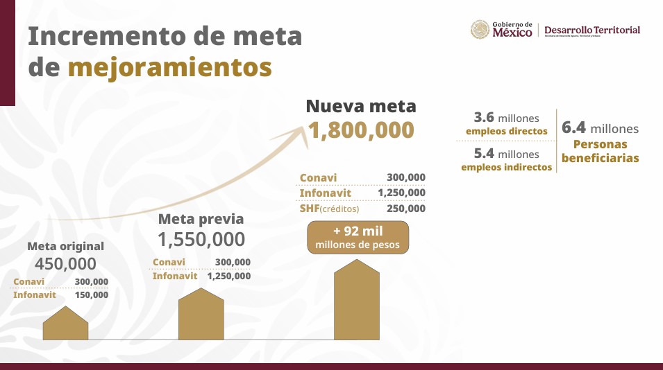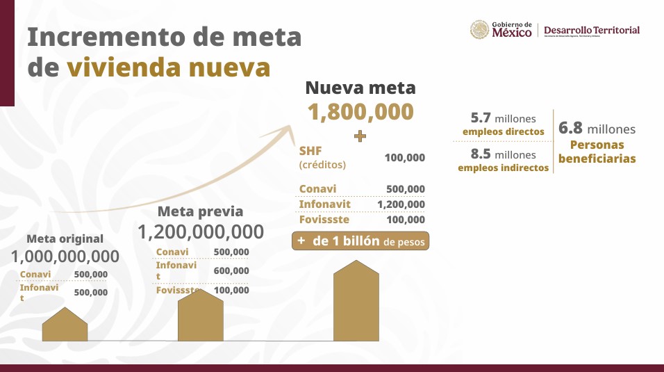 A esto se sumarán 100 mil créditos de la Sociedad Hipotecaria Federal (SHF), con una inversión total superior a un billón de pesos. El impacto económico será relevante: se generarán 5.7 millones de empleos directos y 8.5 millones indirectos.