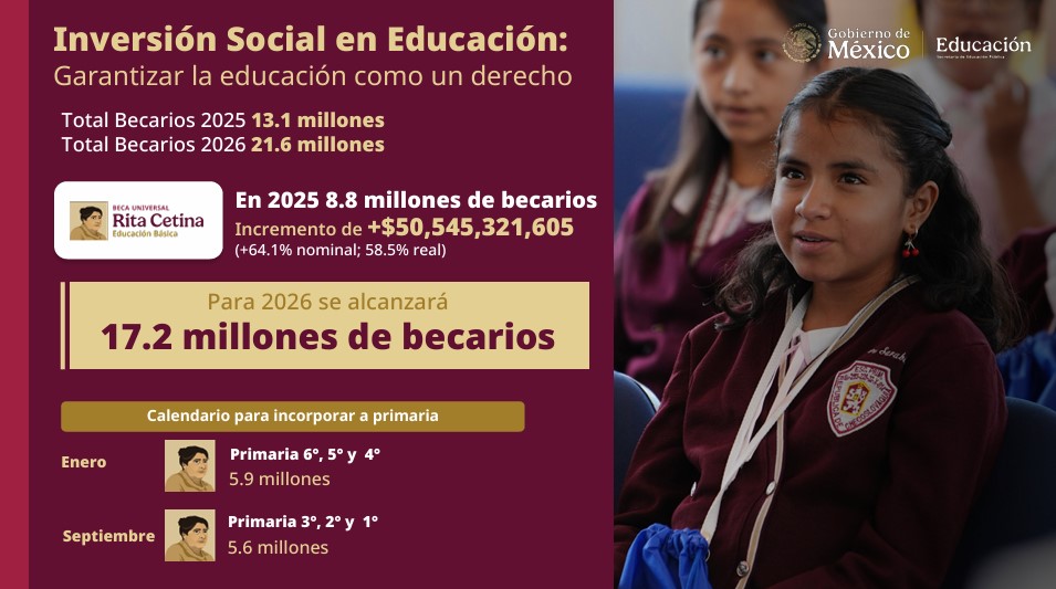 La Beca Rita Cetina para estudiantes de secundaria, en el 2026 se incrementa $50,545,321,605 de pesos para entregarse también a estudiantes de primaria, alcanzando 21.6 millones de becarios; en enero se incorporan 4°, 5° y 6°, y en septiembre 1°, 2° y 3°.