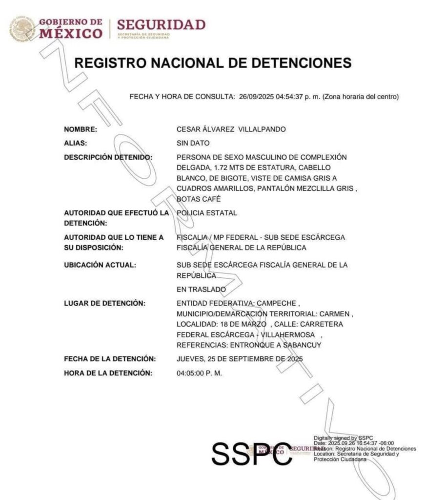 El viernes 26 de septiembre, autoridades federales detuvieron en Campeche a César Álvarez Villalpando, identificado como padre del cantante de regional mexicano Julión Álvarez. La aprehensión ocurrió en la carretera Escárcega–Villahermosa, cuando viajaba acompañado de tres personas en una camioneta que, según los registros, tenía reporte de robo.