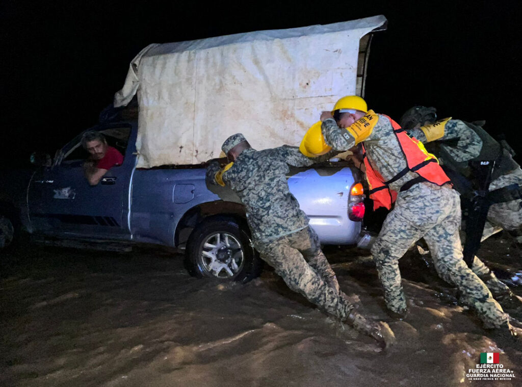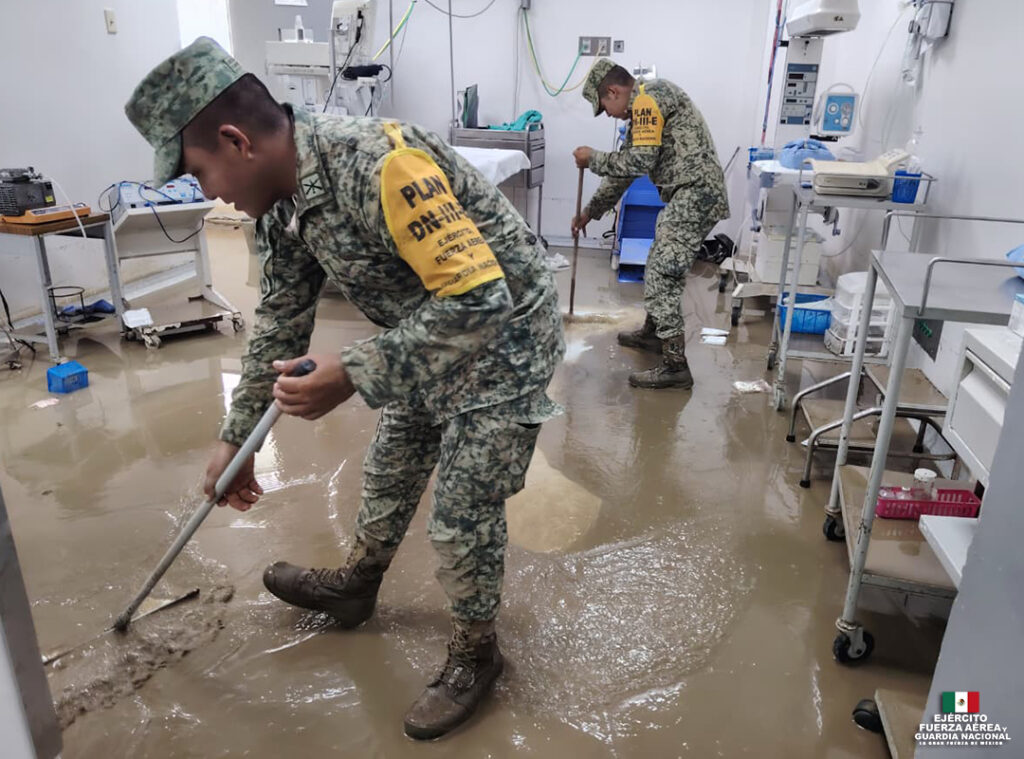 Elementos de la Secretaría de la Defensa Nacional (Sedena), la Secretaría de Marina (Semar), la Guardia Nacional, Protección Civil, CFE y Conagua trabajan en conjunto para atender a las comunidades afectadas. Las labores incluyen evacuaciones, suministro de víveres, restablecimiento de electricidad, limpieza de vías y reconstrucción de infraestructura básica.