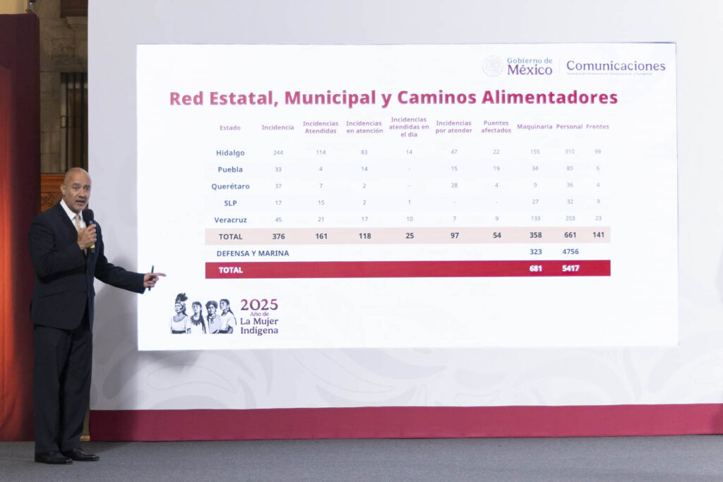 La mandataria anunció la implementación del Sistema Estratégico de Control y Seguimiento de Incidencias, una herramienta que permite identificar caminos obstruidos, necesidades de maquinaria y planes de acción para su rehabilitación. “A cinco días de las lluvias tenemos ya una información muy detallada; pero, además, un avance muy importante”, señaló.
