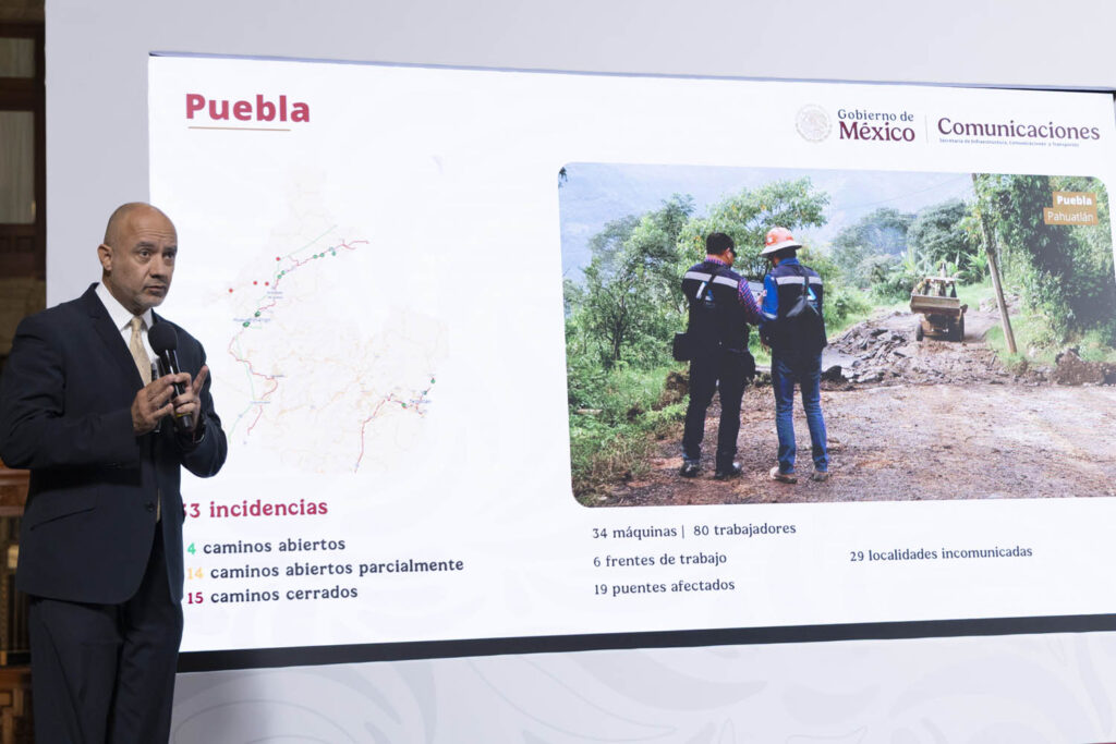 El secretario de Infraestructura, Jesús Antonio Esteva Medina, reportó que ya se ha liberado el paso en 25 tramos carreteros, aunque 54 puentes siguen afectados. Se encuentran trabajando cinco mil 417 personas con 681 máquinas distribuidas en 141 frentes.