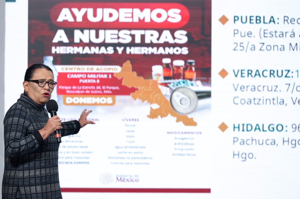 En su intervención, la secretaria de Gobernación, Rosa Icela Rodríguez, destacó la importancia de los centros de acopio en la logística de ayuda. Indicó que en la Ciudad de México, los insumos reunidos están siendo trasladados al Campo Militar Número 1, desde donde se coordina su distribución.