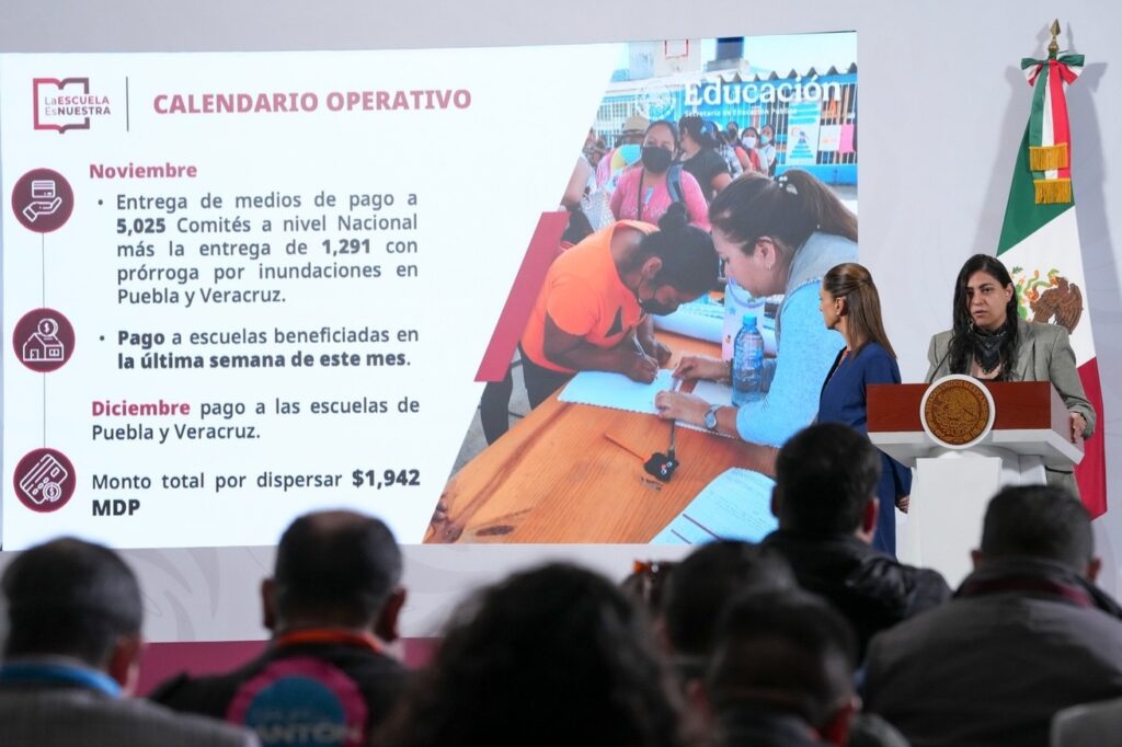 Por su parte, la directora general del programa LEEN, Pamela López Ruiz, informó que en 2025 se han beneficiado 69 mil 302 escuelas: 63 mil 252 de nivel básico y 6 mil 50 de media superior, producto de una inversión de 25 mil mdp que alcanza a 8.1 millones de estudiantes. Señaló que durante noviembre se entregan medios de pago a 5 mil 25 Comités, mientras que en diciembre se dispersarán mil 942 millones de pesos para escuelas de Puebla y Veracruz.