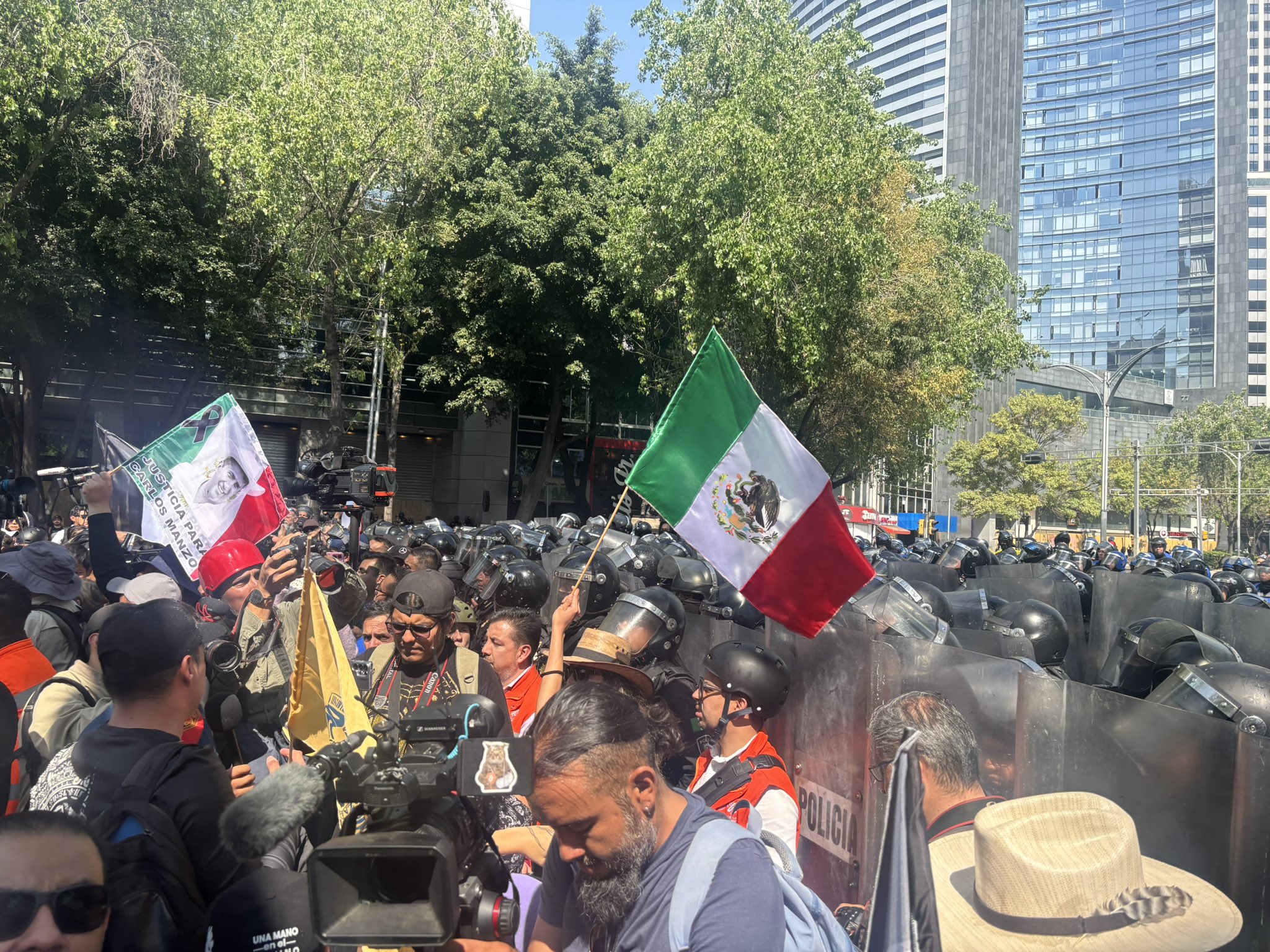 El contingente avanzó y pocos metros adelante se integraron más personas. En Paseo de la Reforma, algunos de los recién llegados, a manera de mofa y con gritos, comenzaron a pedirle “abrazos” al cuerpo de granaderos que les cerró el paso; mientras eso ocurría, otros permanecían callados, o inexpresivos tecleaban susdispositivos móviles. La concentración reunió a cerca de cien personas y, aunque hubo tensión y consignas directas hacia la policía, no se registraron enfrentamientos físicos. Minutos después, entonaron el himno nacional que se escuchaba a lo lejos.