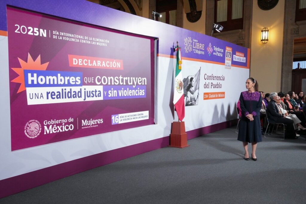 México; 25 de noviembre 2025.— En el Día Internacional de la Eliminación de la Violencia contra las Mujeres (25N), la presidenta Claudia Sheinbaum Pardo encabezó, desde Palacio Nacional, un acto con su gabinete legal y ampliado para reafirmar el compromiso del Gobierno de México con la protección y los derechos de las mujeres. Teniendo como marco la Mañanera del Pueblo, las y los gobernadores del país se adhirieron a un acuerdo nacional por las mujeres y se presentaron los avances del Plan Integral contra el Abuso Sexual.