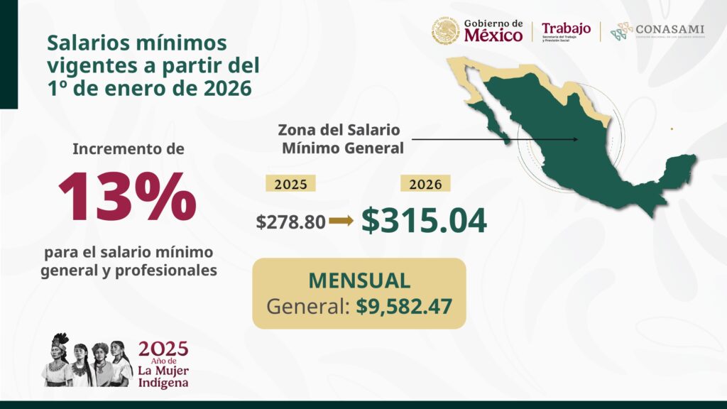 México; 3 de diciembre 2025.— El Gobierno de México formalizó un nuevo acuerdo con los sectores obrero y empresarial para incrementar el salario mínimo a partir del 1 de enero de 2026, con un impacto directo en 8.5 millones de personas trabajadoras. La Presidenta Claudia Sheinbaum Pardo confirmó que el ajuste será del 13% a nivel general, lo que elevará el ingreso diario a 315.04 pesos, equivalente a 9,582.47 pesos mensuales.