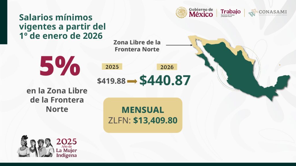 En la Zona Libre de la Frontera Norte (ZLFN), donde se concentran condiciones salariales diferenciadas, el aumento acordado será del 5%, con lo que el salario mínimo alcanzará los 440.87 pesos diarios, es decir, 13,409.80 pesos mensuales.