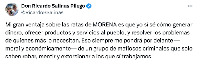 En su posicionamiento, Salinas Pliego señaló que su intención es dar por cerrado el conflicto con el gobierno, y pese a sus constantes expresiones hostiles através de las redes sociales, también aseguró que desde el inicio ha existido disposición de su parte para alcanzar un acuerdo: “nuestro objetivo es cerrar este capítulo y dar por concluidas las diferencias con el gobierno; por nuestra parte siempre ha existido disposición para encontrar una solución”, expresó.