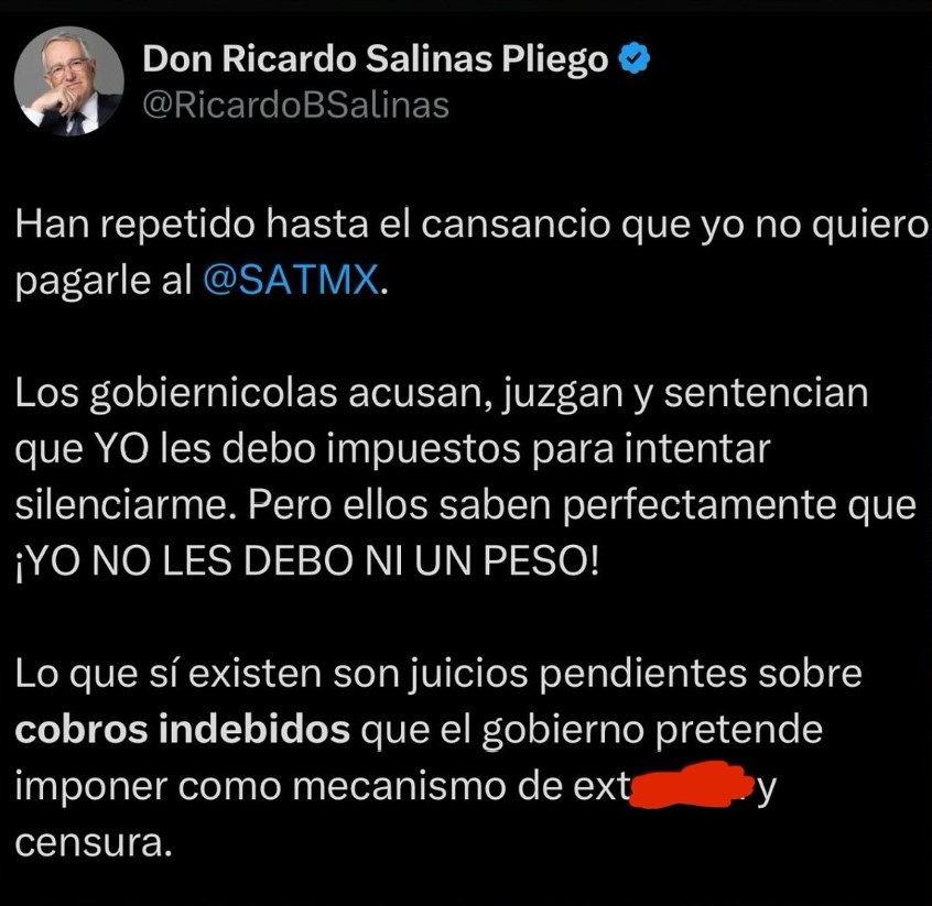 Ante el inminente cobro, Salinas Pliego insistió en que lo más responsable es esperar a que el SAT precise formalmente el adeudo señalado: “estoy seguro que lo más prudente y responsable de parte de nosotros y del Gobierno de México es esperar a enero, a que el SAT precise por escrito los fundamentos de la cifra que señala como adeudo de $31 Mil Millones de pesos y nos entregue el desglose detallado y transparente de los cálculos que la sustentan”.