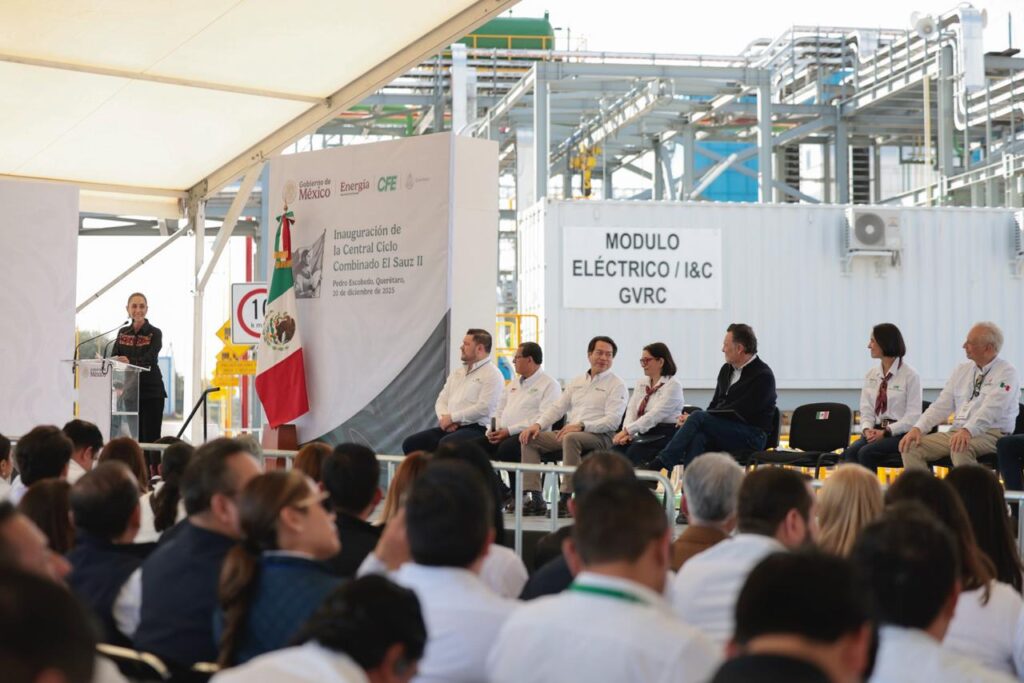 Querétaro, México; 20 de diciembre 2025.— Con un acto realizado en el municipio de Pedro Escobedo, Querétaro, la presidenta de México, Claudia Sheinbaum Pardo, encabezó la inauguración de la Central de Ciclo Combinado (CCC) El Sauz II “Josefa Ortiz Téllez Girón”, una obra de la Comisión Federal de Electricidad (CFE) que aportará 269 megawatts (MW) y beneficiará a más de 4 millones de mexicanas y mexicanos.