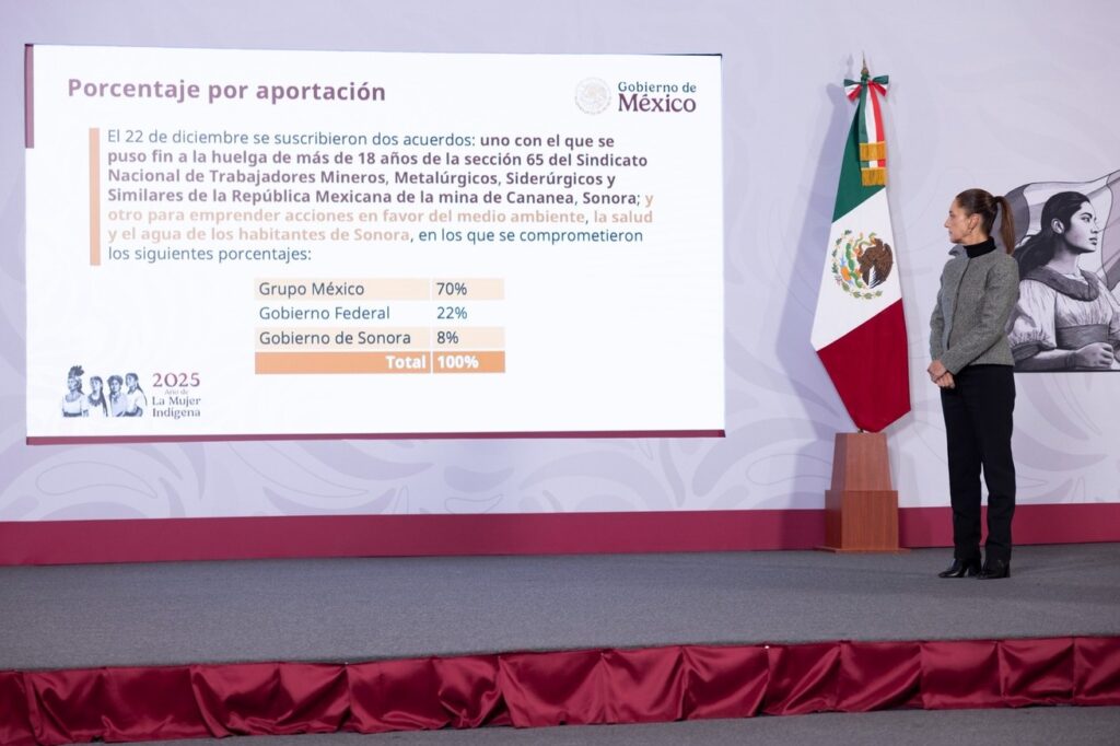 México; 29 de diciembre 2025.— Con el objetivo de saldar una deuda histórica con los trabajadores mineros y las comunidades afectadas, la presidenta Claudia Sheinbaum Pardo informó este lunes que en enero de 2026 comenzará la construcción de las obras contempladas en el Plan de Justicia para Cananea, Sonora, luego de alcanzarse un acuerdo con los mineros de la región tras más de 18 años de huelga.