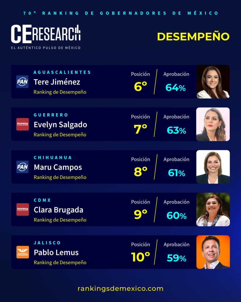 Más abajo, pero aún dentro del bloque con mayor aprobación, se agrupan perfiles que mantienen una narrativa de estabilidad y cercanía con sus electorados. El 6° lugar es para Tere Jiménez, gobernadora de Aguascalientes por el PAN, con 64% de aprobación. En el 7° se encuentra Evelyn Salgado, mandataria de Guerrero por Morena, con 63%. Chihuahua aparece en el 8° lugar con Maru Campos, también del PAN, quien alcanza 61%. La jefa de Gobierno de la Ciudad de México, Clara Brugada, se posiciona en el 9° lugar con 60% de aprobación, y el 10° lugar corresponde a Pablo Lemus, gobernador de Jalisco por Movimiento Ciudadano.
