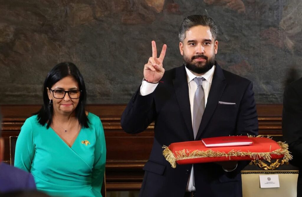 La funcionaria mantuvo la mano derecha en alto mientras la izquierda reposaba sobre la Constitución, sostenida por el diputado Nicolás Ernesto Maduro Guerra, hijo del presidente Maduro, quien horas antes había participado en la sesión de instalación del nuevo periodo legislativo y manifestó su respaldo a la mandataria encargada.