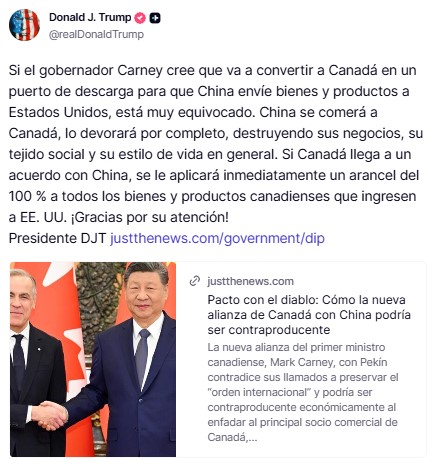 A través de su red Truth Social, Trump lanzó el mensaje directamente contra el primer ministro canadiense, Mark Carney. “Si el primer ministro canadiense, Mark Carney, cree que va a convertir a Canadá en un ‘puerto de descarga’ para que China envíe bienes y productos a Estados Unidos, está muy equivocado”, escribió.