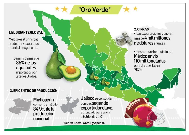 Durante el Supertazón 59, en 2025, México exportó alrededor de 110 mil toneladas de aguacate, equivalentes a 250 millones de piezas, lo que generó un impacto económico de 317 millones de dólares en un periodo de 30 días. Para este año, la Asociación de Productores y Empacadores Exportadores de Aguacate de México (Apeam) estima que se importarán alrededor de 127 mil toneladas en los 30 días previos al evento.